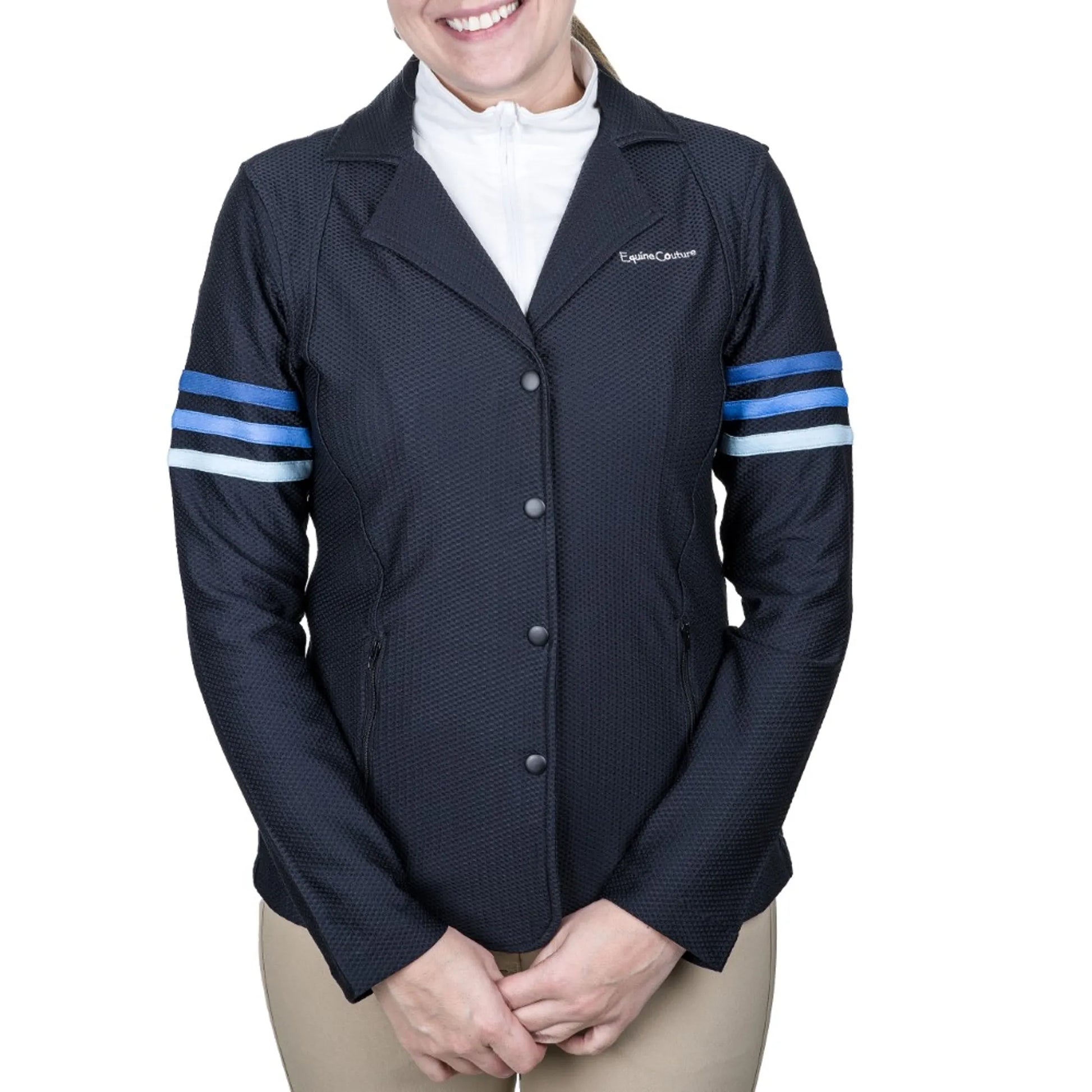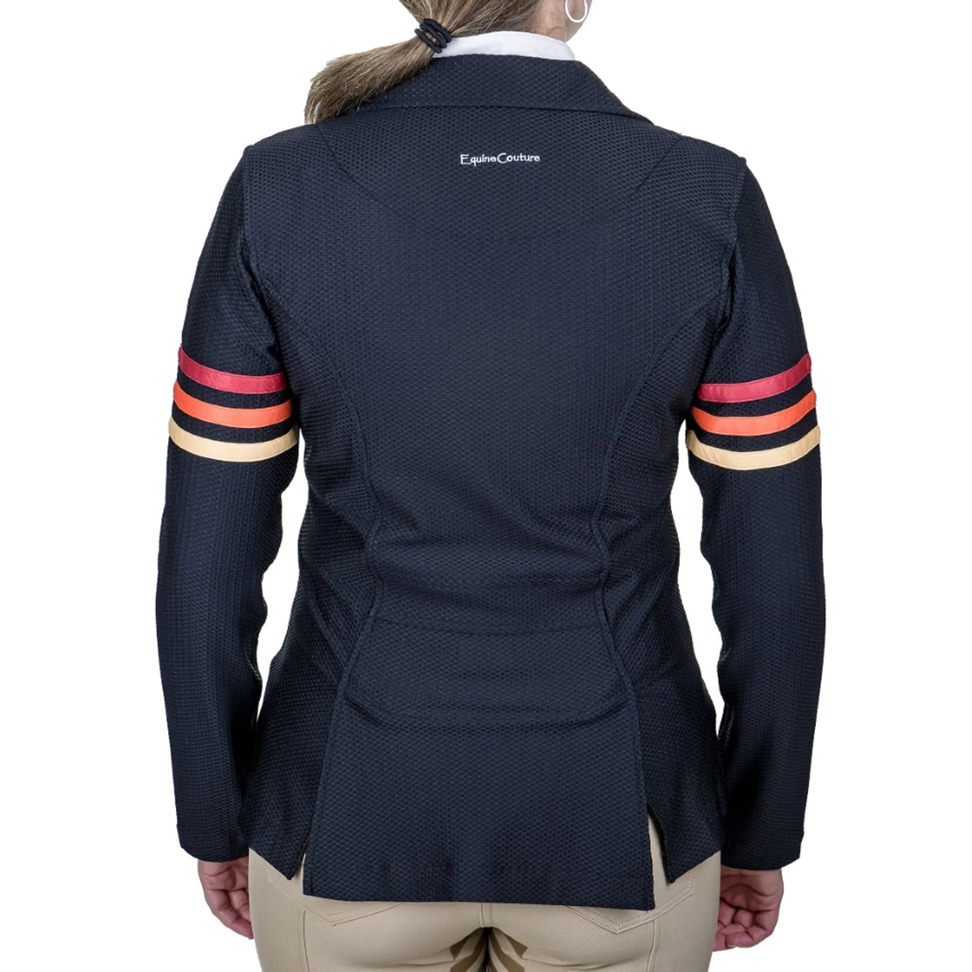 Elevate your equestrian fashion with the remarkable Equine Couture Women's EquiVent Gradient Show Coat with arm stripes. This coat effortlessly combines functionality and style, featuring two front zipper pockets and a hidden zipper concealed beneath a four-button closure. Crafted from a unique waffle-like mesh fabric, the EquiVent Gradient Show Coat ensures exceptional breathability and unmatched comfort.