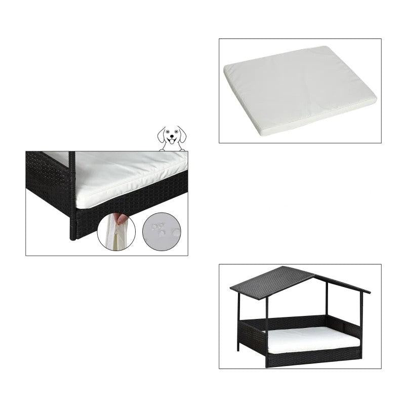 Give your favorite small/medium dog or cat a place that they can call home both indoors and out with the Espresso Wicker Weather Resistant Raised Dog Bed House with 2 in Thick Cushion. This Espresso Wicker Weather Resistant Raised Dog Bed House with 2 in Thick Cushion is suited for small to medium sized animals to use as a home or favorite resting space. Comes with plenty of space to bring toys, blankets, treats. Contemporary style pet cabana design protects from weather and is made with steel and PE rattan. 2 inch thick soft padded cushion provides extra comfort to pets. Protective anti-slip pads keep all four legs sturdy. Elevated legs keeps pets from getting too hot or cold.