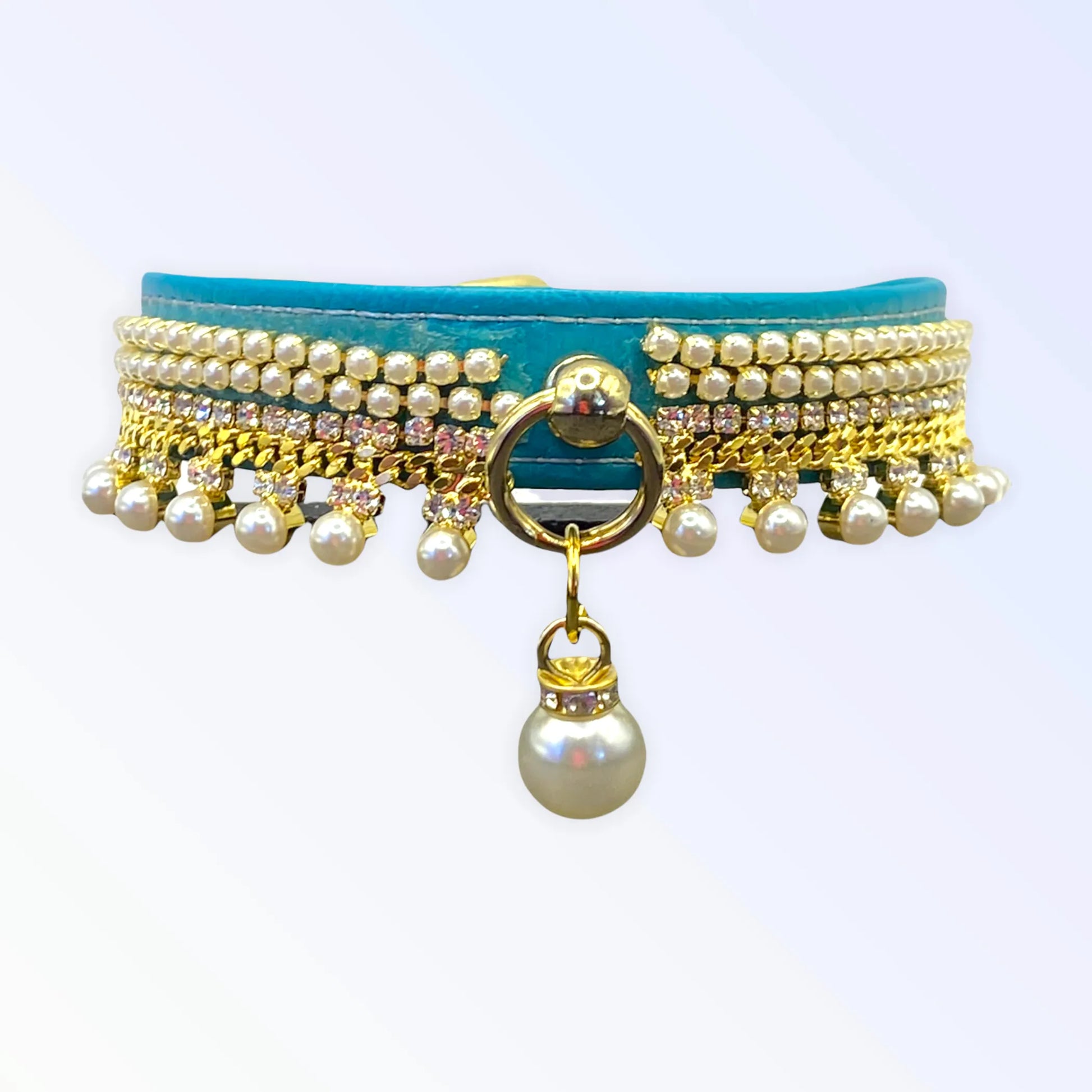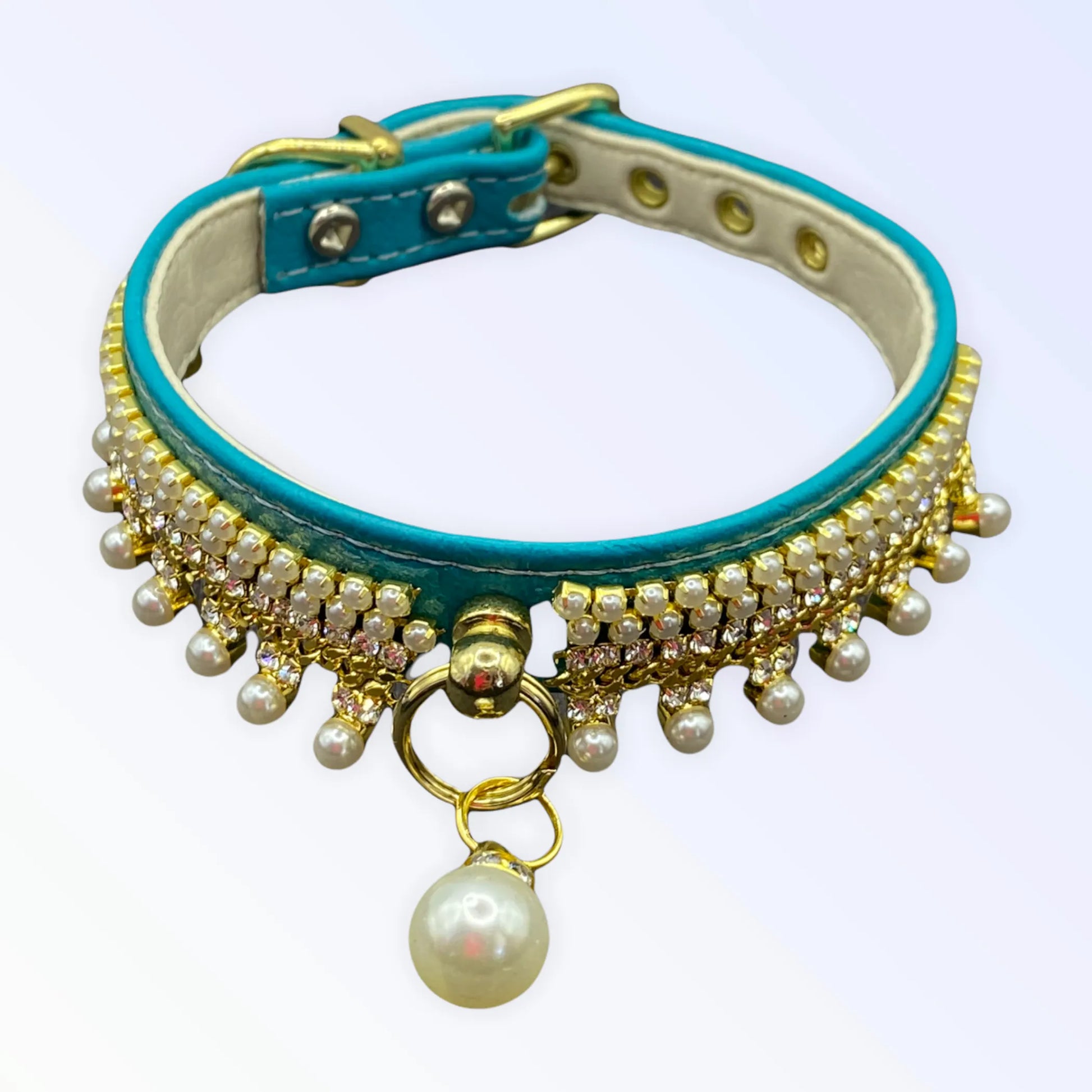 All of our collars, pet jewelry, and accessories are made from vegan leather, which is cleaned and buffed to grip a high grade adhesive. Every pearl, rhinestone, and gem are hand placed and left to be cured for 48 hours to reach its strength bond. From there, we ensure all gems are fully attached and then the collar is placed into its duster bag where they remain until shipping. Each collar takes approximately 1.5 hours to create, and 48 hours to fully dry.
